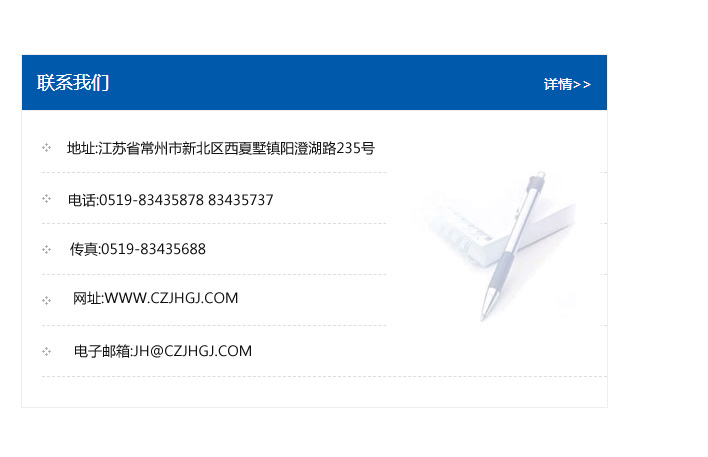 地址:常州市新北區(qū)友邦商務(wù)大廈1幢16、17層  電話:0519-85101652  傳真:0519-85112595  郵編:213022  網(wǎng)址:www.cz-jiayue_cn.kqly8.com  郵箱:xiajifengaa@163.com